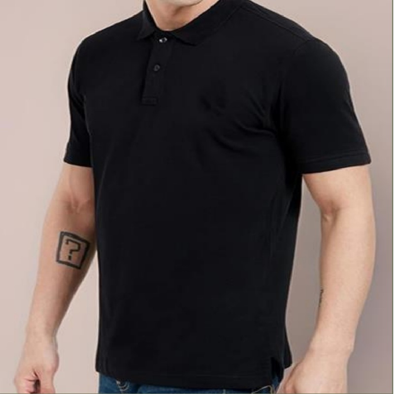 Black Textured Polo Neck T-shirt Material:- 80% cotton 20% polyester Sleeves:- Half sleeves Color:- Black Brand fit:- Regular fit
